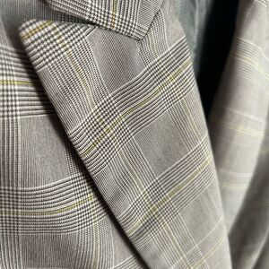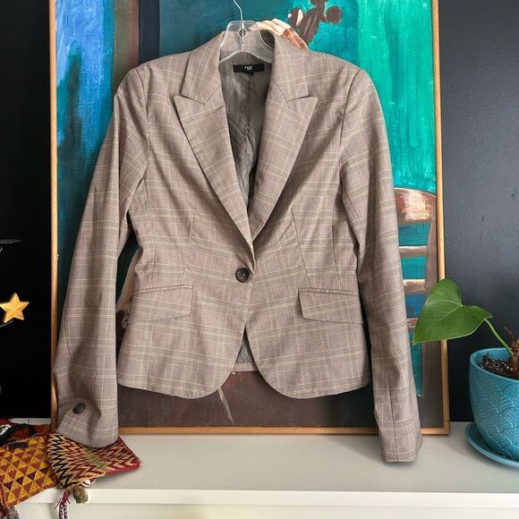 Elegant Cue blazer in a brown plaid pattern. Perfect for a sophisticated look.