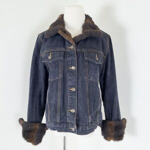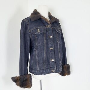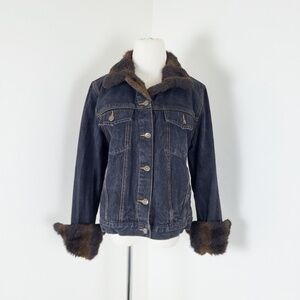 Y2K Denim Jacket Fur Lined Collar Button Up Down Long Sleeve Dark Wash