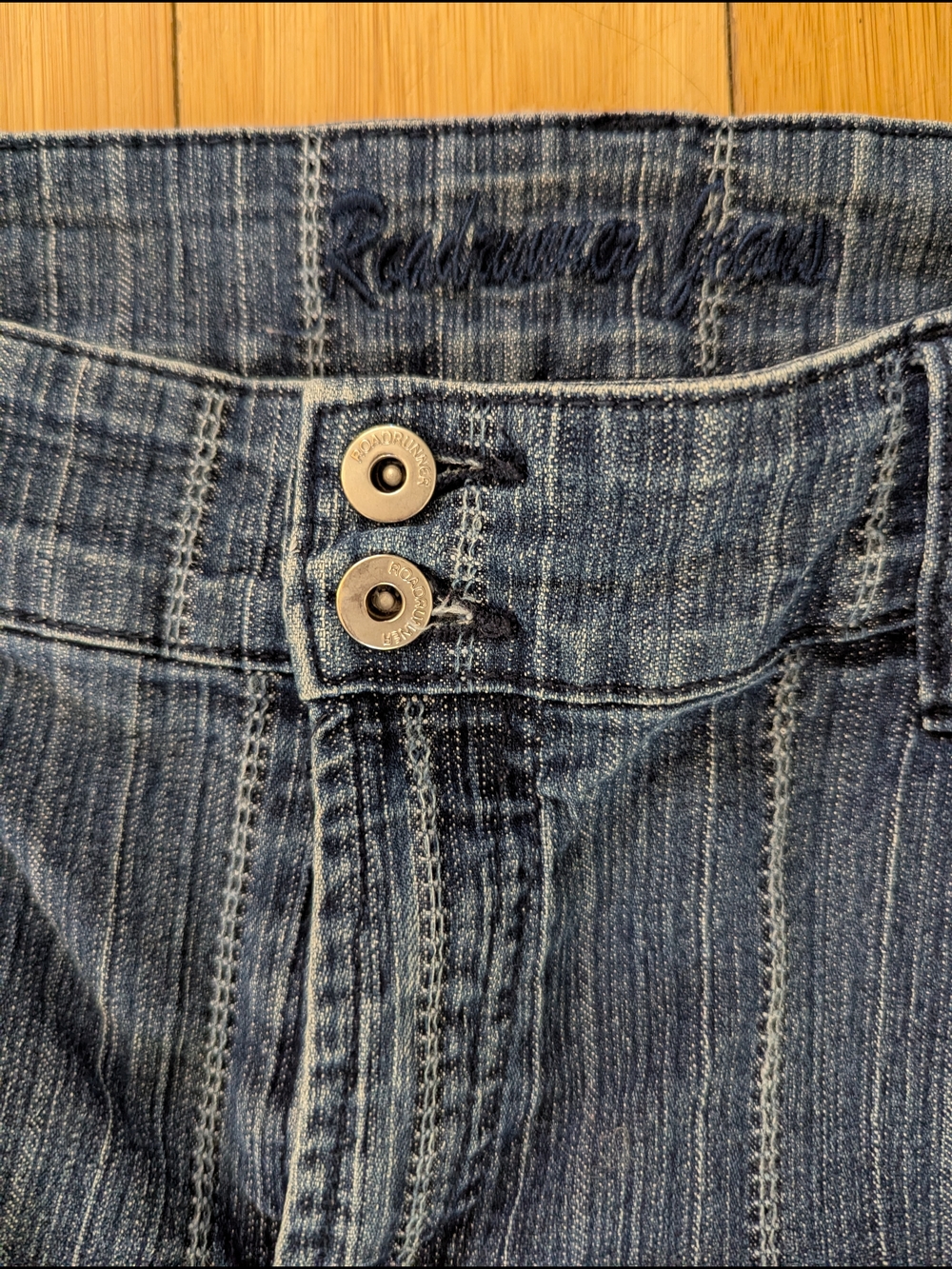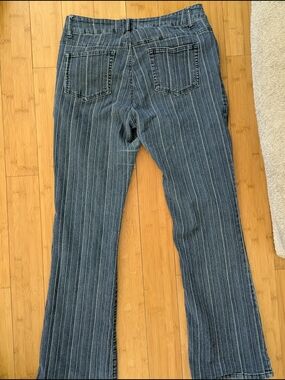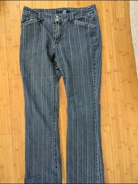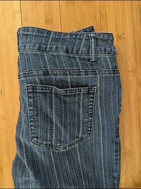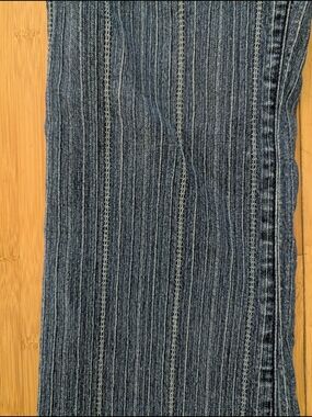 mid rise jeans with subtle vertical striping. Double-button front closure. Classic denim look with stitched details.