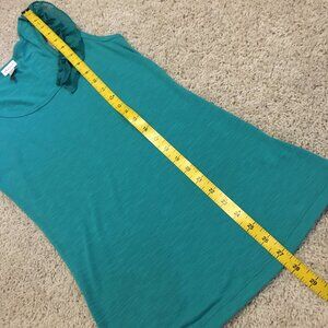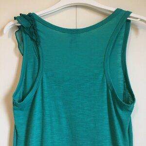 Good preowned Y2K condition, plain, solid aquamarine, soft, stretchy tank top with viscose blend and ruffled detail on the shoulder in chiffon by Dynamite. A little bit of piling, but could easily be taken off with an electric shaver. Cute.