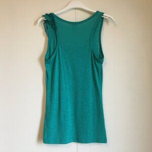 Good preowned Y2K condition, plain, solid aquamarine, soft, stretchy tank top with viscose blend and ruffled detail on the shoulder in chiffon by Dynamite. A little bit of piling, but could easily be taken off with an electric shaver. Cute.