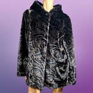 Y2K Faux Fur Coat Size XL Black Brown Mid Length Boho Glam Velvety Luxurious