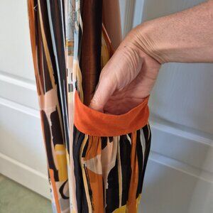 Mid-2000s / Empire waist / Plunging neckline / Cross-back straps / Deep side pockets / Graphic chiffon overlay / Orange silk underlay / Zipper & hook closure