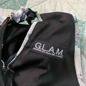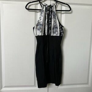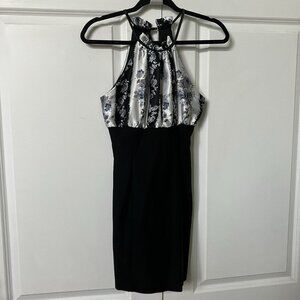 Y2K GLAM Halter Mini Dress Womens S Gray Stripe Black Floral 2000s Vintage