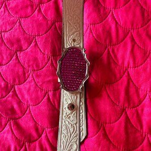 Beautiful white genuine leather belt, with designs, from the 2000's. Bright pink rhinestones on the buckle ! none missing.