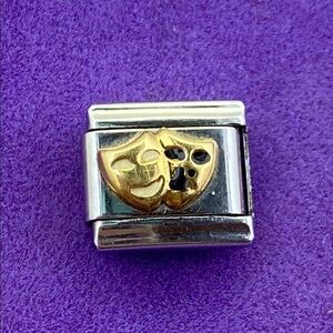 Elegant charm featuring a gold drama mask on a silver base. Perfect for bracelets or necklaces.