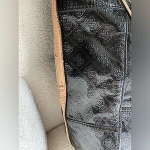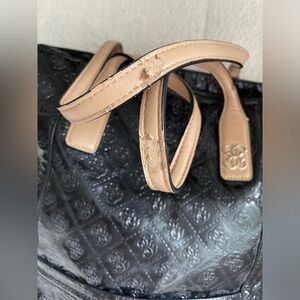 Elegant Guess tote with embossed black design. Tan handles and trim add contrast. Ideal for daily use.