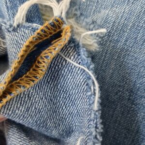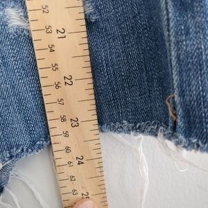 Stylish distressed denim skirt with a frayed hem. Features a front slit for added flair. Perfect for casual outings.