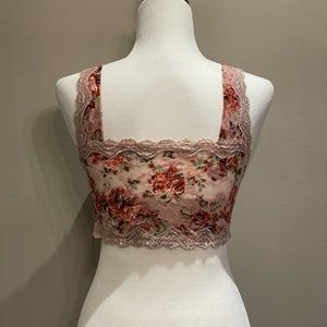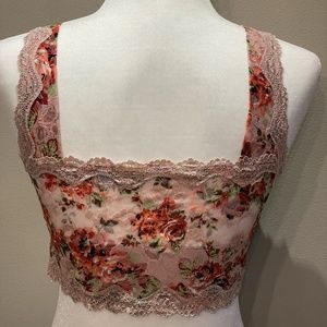 Soft mesh with a beautiful rose print featuring delicate sheer lace in a heart-shaped neckline finished with a little sparkling charm in the centre. High sides and back with fixed cups for comfortable support with the most romantic look. It's sexy-made-comfy in such soft, stretchy lace with a high back that smooths any lumps and bumps around the arms (aka no bra bulge). Flexible straps adjust to your body with this pull on piece. Adds oomph on its own or under any outfit as the sheer lace sits higher, creating a sweet peekaboo under a deep-v neckline.
