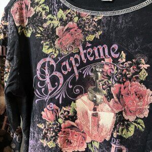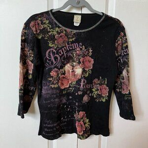 Y2K Jess & Jane Shirt Perfume Bottle Floral Rhinestone Bejeweled AOP ¾ Sleeve T-shirt