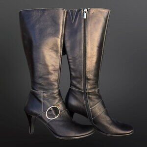 Y2K Knee High Tall Boots Size 9.5 Black Leather Buckle Stiletto Heels EUR 40