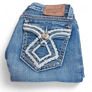 Turn heads in these vintage LA Idol Y2K jeans, featuring bold embroidered button-flap back pockets, thick contrast stitching, and sparkling bling details for that true 2000s Western glam vibe.