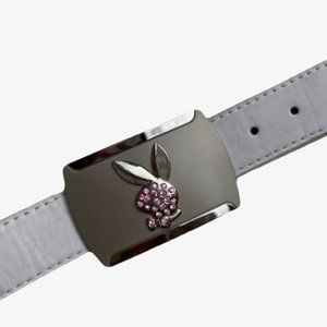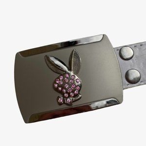 Y2K white leather authentic playboy belt with pink rhinestone and silver buckle detailing. Used, in great condition. Size is unknown, but measurements will be provided.