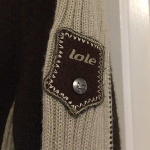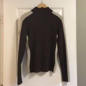 Excellent preowned vintage condition, dark brown and beige mock neck sweater by Lole, with a zipper at the collar and patch on left arm. A flattering fit. Cute, sporty and preppy. Very nice quality. Vintage is always better.