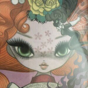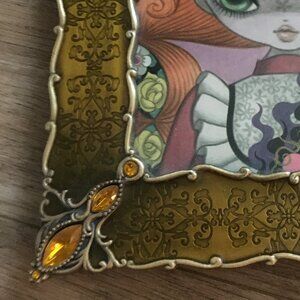 Very good preowned condition desk frame made of glass with wood frame made of silvery metal, with golden yellow enamel and orange inlaid gem/rhinestones and glass cover. Includes a limited exclusive Junko Mizuno promo card. Gorgeous frame in great shape for its age (Y2K).
