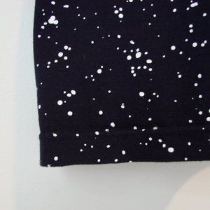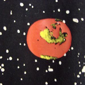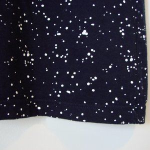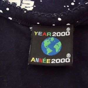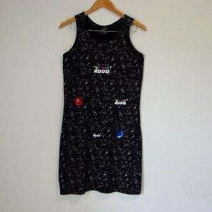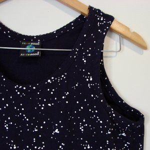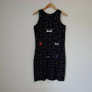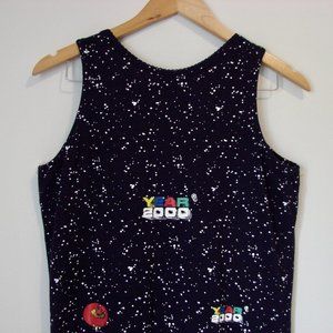 - very cute Y2K tank dress features a navy blue background with white splotches, planets and Year 2000 throughout for a far out kind of space feel