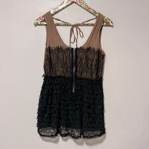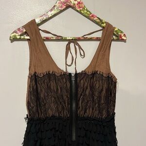 Label: Miss Me Material: 30% silk 70% cotton Black lace overlay on silk bodice with large zipper front closure, a juxtaposition with the feathery distressed cutout flowy bottom, adjustable string ties at back of neck.