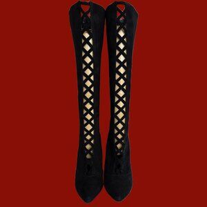 * Y2K Nine West black suede pointed toe stiletto heels with faux lace up criss cross cut out front