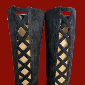 Y2K Nine West Black Suede Knee High Boots US Size 7.5 Pointed Toe Heels Zippers