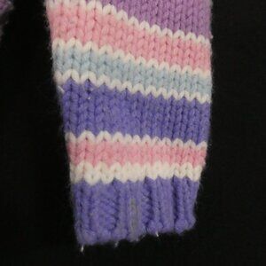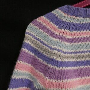 The sweater boasts a combination of purple, pink, and blue stripes, creating a visually appealing and cozy design
