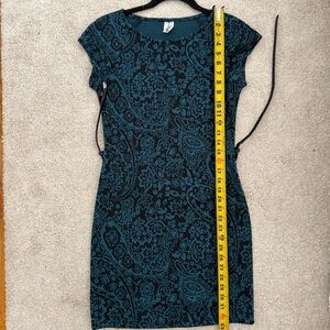 Chic teal mini dress with floral patterns. Features a sleek design. Perfect for versatile wear. Fits like a small or xsmall
