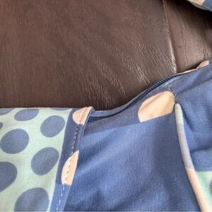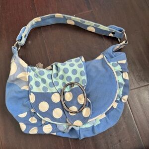 Stylish and unique, this polka dot patchwork shoulder bag is perfect for adding a pop of color to your outfit. Featuring a blend of blue and cream tones, it's both trendy and versatile.