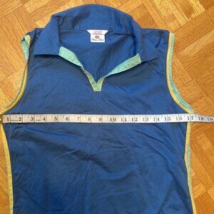 Vintage Grace Lane sleeveless collared top in a striking blue with mint contrast trim. Features a flattering v-neckline and athletic-inspired silhouette. Breathable and lightweight — great for layering or worn alone on warmer days.