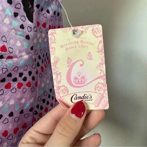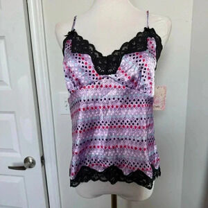 Stylish Candie's cami top. Features a purple pattern with black lace trim. Perfect for a chic look.