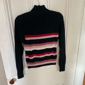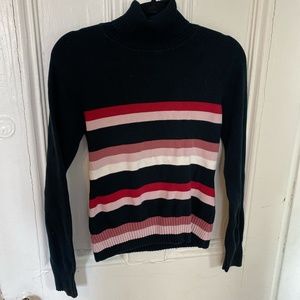 Y2K sweater from RW&co. Features flattering ribbed material along the turtle neck, bottom of the sweater and bottom of the sleeves. Multi coloured Pink, Red, and cream stripes on a black background