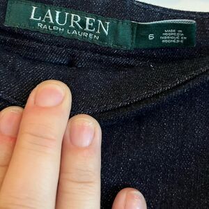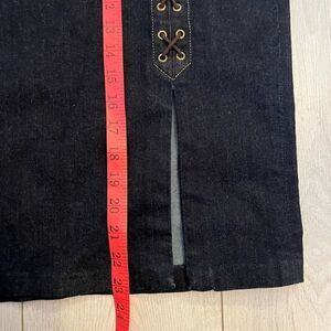 Totally Y2K denim skirt. Lauren Ralph Lauren dark indigo denim knee length pencil skirt with brown leather lace up detail, and side zipper. Size 6. True to size. This is meant to be a lower rise, quite stretchy. Excellent condition.