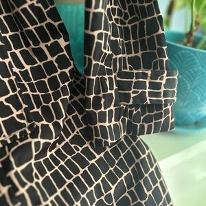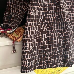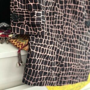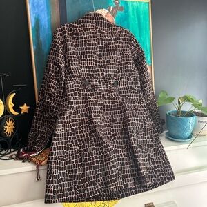 Chic trench coat with a unique black and brown pattern. Perfect for stylish outings. Ptp 19.5", Length 35", waist up to 36", shoulders 16.5", Sleeves 24" seam undone at sleeve see video, not noticeable in good condition.