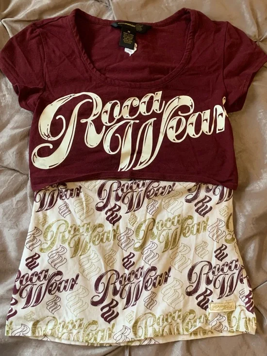 Rocawear branded tee in rich burgundy. Cream logo and script detailing on the front. Casual streetwear look. Comfortable cotton blend fabric. Note: shirt is a tube top with crop over shirt ATTACHED as shown in pictures