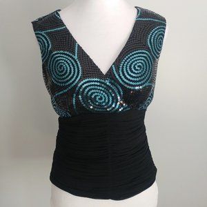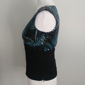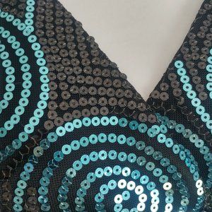 Y2K Sequined Dress Top Crossover V Neck Textured Ruched Bodycon Teal Blue Black