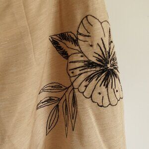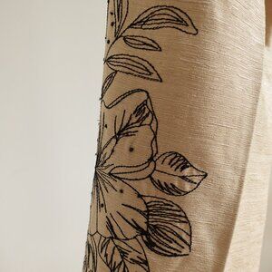 Elevate your wardrobe with these elegant Silkland Petite women's pants in a sophisticated beige color. Featuring exquisite black floral embroidery, these pants combine comfort with style. Made from high-quality materials, the shell is 100% silk, while the lining is 100% polyester, offering a luxurious feel. The elastic waistband ensures a comfortable fit, perfect for any occasion. The pants have a wide-leg design that provides a relaxed and comfortable fit. The pants are in excellent condition, ready to add a touch of class to your collection.