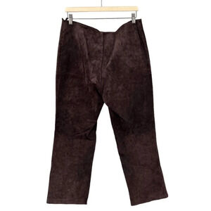 *Brown suede leather, fully lined, one leg embellished with floral and faux stones.