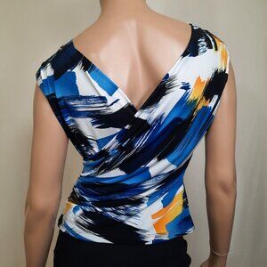 Y2K Sleeveless Surplice Side Tie Top Size M Ruched Blue Orange Abstract Print