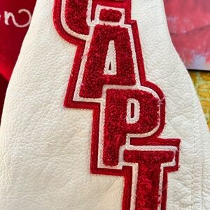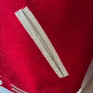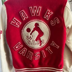 This jacket belonged to my daughter and she absolutely loved it! It has unfortunately become too small for her .... This is a rare TRUE RELIGION Hawks Varsity Jacket White leather sleeves White leather slit pockets Red and white wool outer Polyester lining Size is a SMALL to MEDIUM (the tag says Medium but it fits more like a SMALL) As NEW