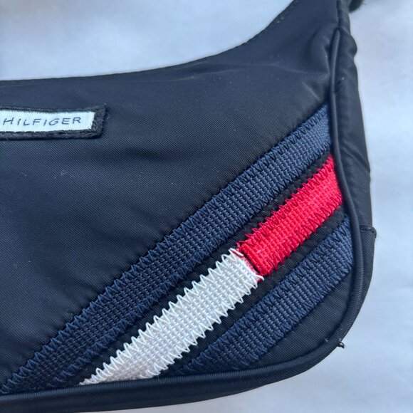 Y2K black bag featuring bold red and white stripes. Iconic Tommy Hilfiger style.