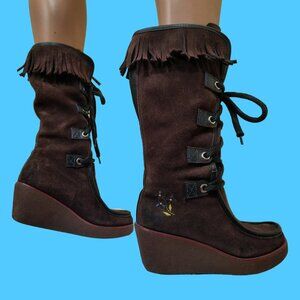 * Y2K Tommy Hilfiger brown suede lace up fringed wedge boots with embroidered flower detail