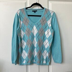 Y2K Tommy Hilfiger Sweater Womens L Prep Academia V-neck Argyle Cotton Knit