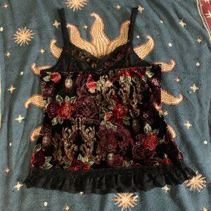 A velvet tank top with lace trim and details, from the 2000's