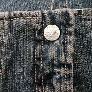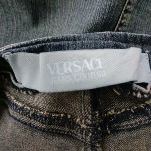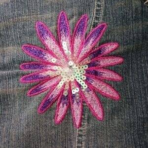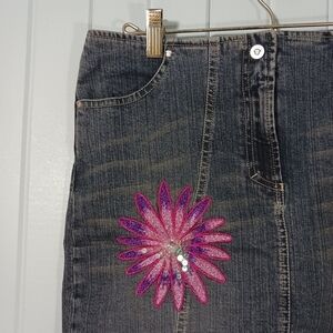 vintage Versace jeans couture skirt embroidered with a pink and purple flower with sequin.
