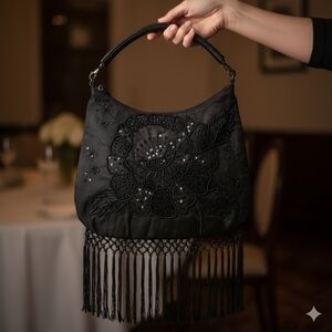 Y2K Vintage Black Beaded Fringe Sequin Evening Bag Mini Purse Party