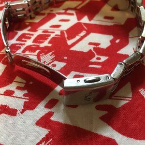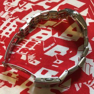 Good preowned vintage condition, metal band Jones New York Watch with indigo-blue face (dark indigo blue with a hint of grey). Looks lighter in direct sunlight. There is some light scratching throughout (mainly on the closure and back). Selling for parts. I'm pretty sure this works as it was working a couple years ago. Battery will need to be replaced. Selling as is.