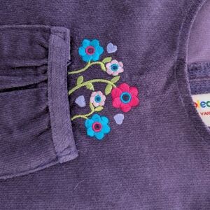 Adorable purple corduroy dress featuring floral embroidery on the pocket. Perfect for a stylish look.