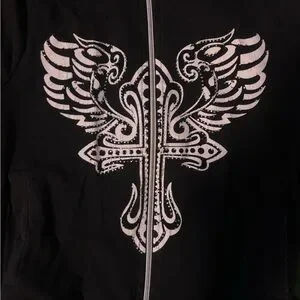 Stylish black jacket featuring a striking white winged cross design. Full zip closure. Perfect for casual wear.