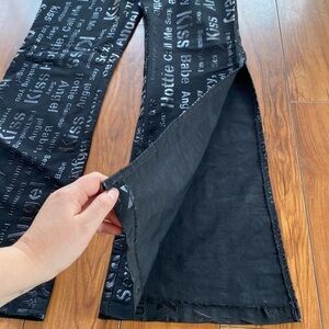 insanely amazing 90s / early 2000s flare all over print slogan pants!! Says stuff like sexy, hottie, angel, babe, call me, cutie and more all over the pants! Bottom have slits at the flare. Zipper on the right side for easy on and off l. Material is stretchy