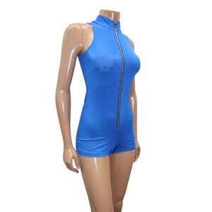 Turn heads in this bold blue sleeveless romper! Designed with a modern mock neck and an edgy full zip-front closure, this fitted one-piece offers both comfort and style. The stretchy fabric hugs your curves, making it perfect for summer parties, festivals, or athleisure looks. Pair it with sneakers or sandals for an effortless, sporty vibe!