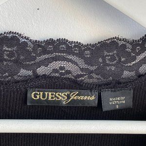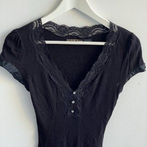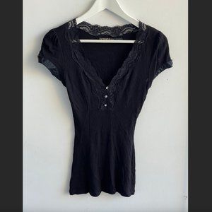 Lovely top with lace trim neckline and satin trim sleeve details. Good used condition.