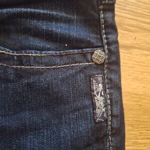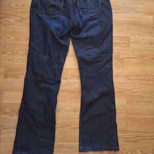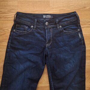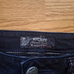 Dark wash low rise jeans from the brand Silver! Super cute embellishments and in good condition, they're just too big for me💔